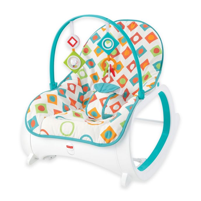 The fisher price infant to toddler rocker starts out as an infant rocker or stationary seat with bat at toys overhead.
